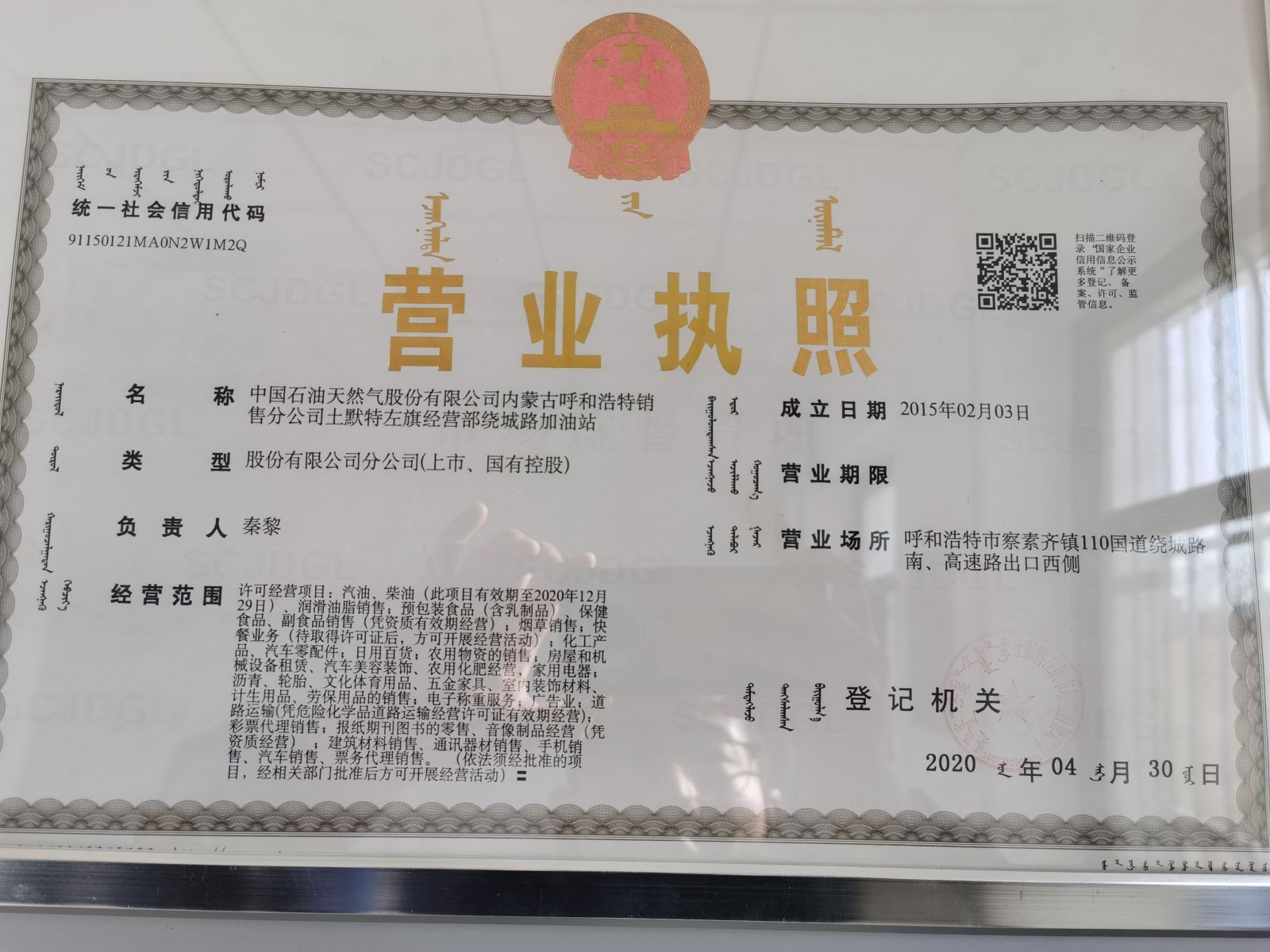 中國(guó)石油天然氣股份有限公司內(nèi)蒙古呼和浩特銷售分公司土默特左旗經(jīng)營(yíng)部繞城路加油站危險(xiǎn)化學(xué)品經(jīng)營(yíng)許可證有效期為2017年12月30日至2020年12月29日,證書登記編號(hào)為蒙A應(yīng)急經(jīng)字[2020]0001062。